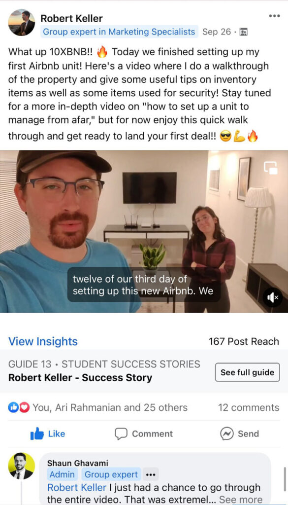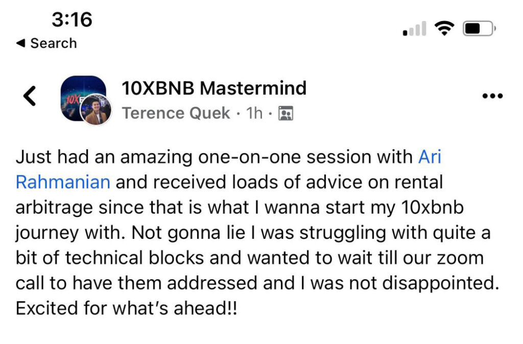 Training material and coaching are first class. 10XBNB answered all my questions and gave me some great goals to work towards before our next call. Add to that the weekly town hall meetings and Facebook chat and if you put the work in you are basically guaranteed to succeed.